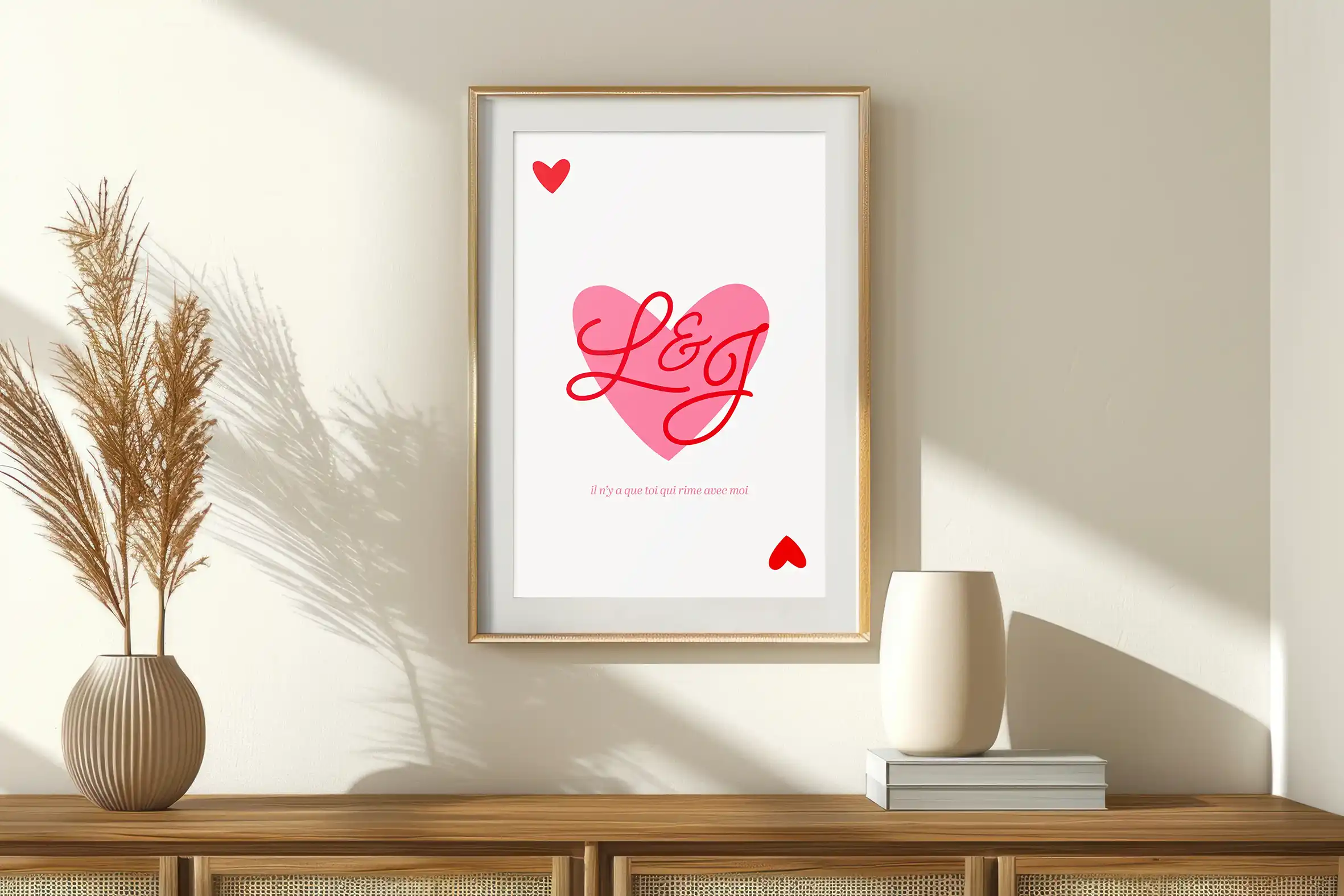 Sous le cœur, vous pouvez ajouter le texte de votre choix : une phrase symbolique, une date importante, un lieu cher ou quelques mots doux. Cette liberté de personnalisation transforme chaque affiche en une création unique, chargée de sens.