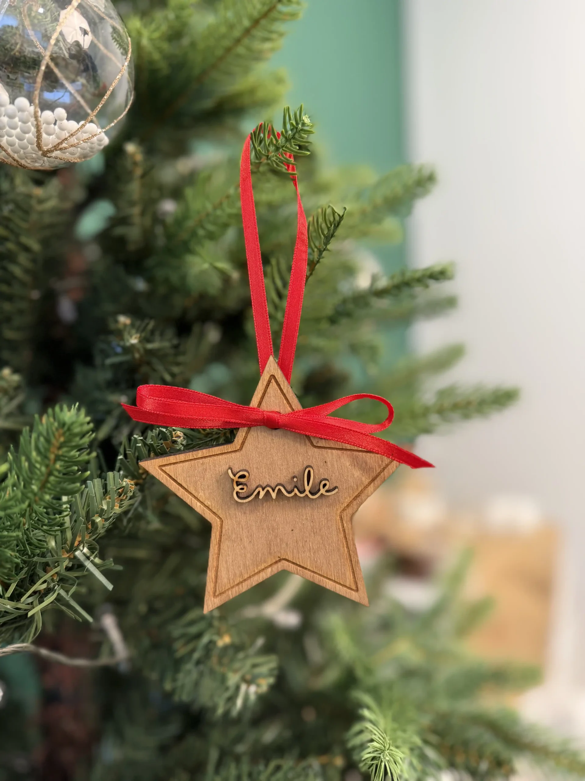 Une étoile de Noël personnalisée en bois, simple et élégante, avec le prénom en relief. Fabriquée artisanalement dans notre atelier angevin, elle apportera une touche naturelle et unique à votre sapin.